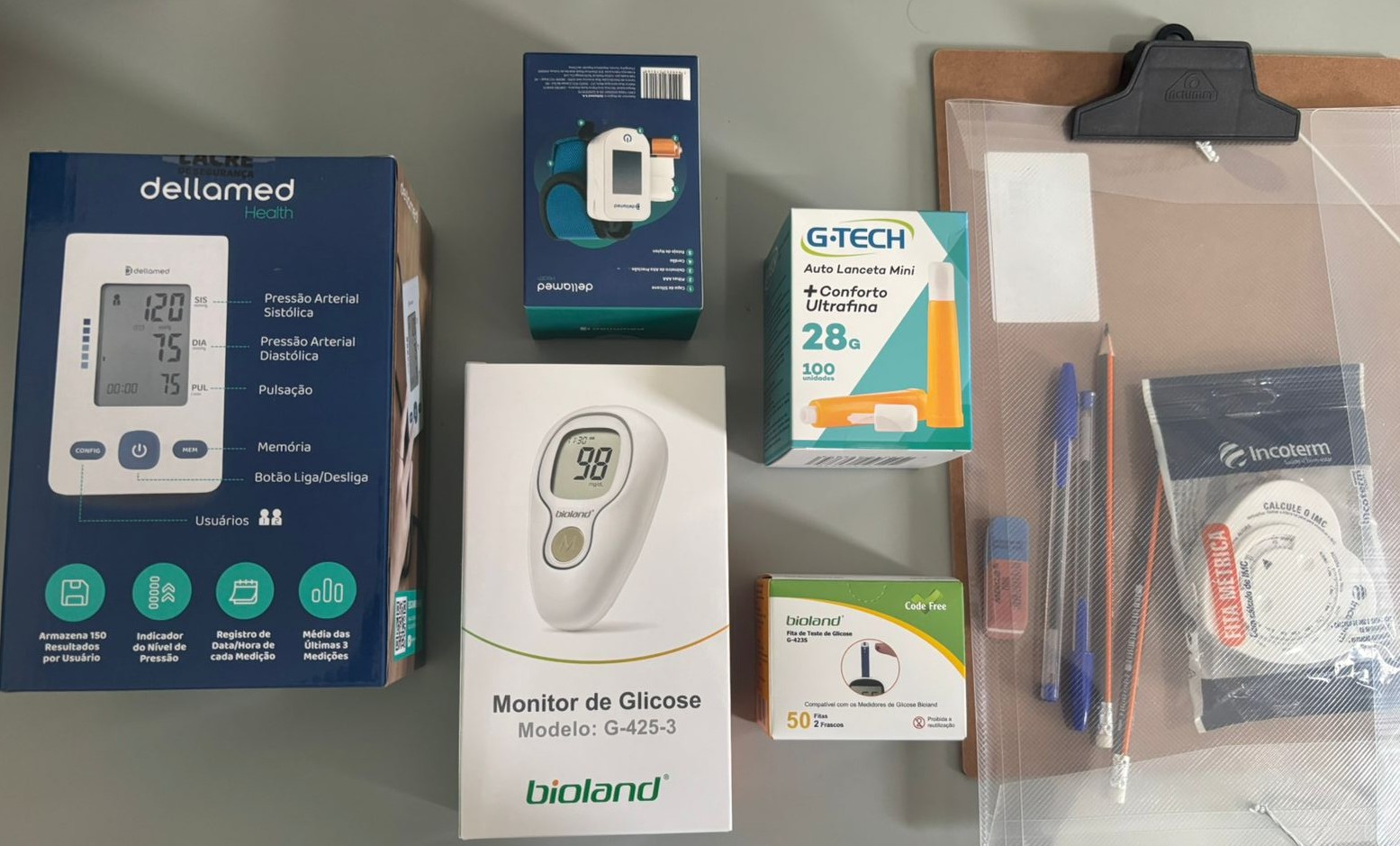 Foram entregues aos profissionais de saúde: camisas de mangas longas, camisas de mangas curtas, aparelhos de pressão digital, glicosímetros, oxímetros, fitas, lanceta, fitas métricas e materiais de expediente.