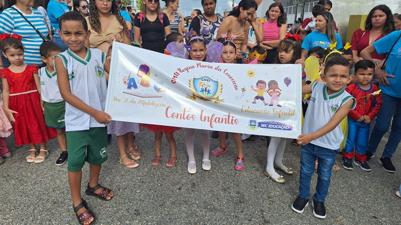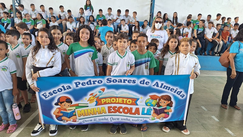 A EMEIF Pedro Soares de Almeida e o Programa de Recuperação de Aprendizagens caminharam no mesmo pelotão reforçando o compromisso da escola com o incentivo a leitura e ao desenvolvimento da aprendizagem. A Turma do 2º Ano A trouxe plaquinhas com frases que incentivam a leitura; a Turma do 2º Ano B apresentou um banner do Conto Cachinhos Dourados e Os Três Ursos; a Turma do 3º Ano veio representando a Literatura de Cordel, valorizando a Cultura Nordestina e os cordealistas; a Turma do 5º Ano A apresentou o Projeto Malas Viajantes.