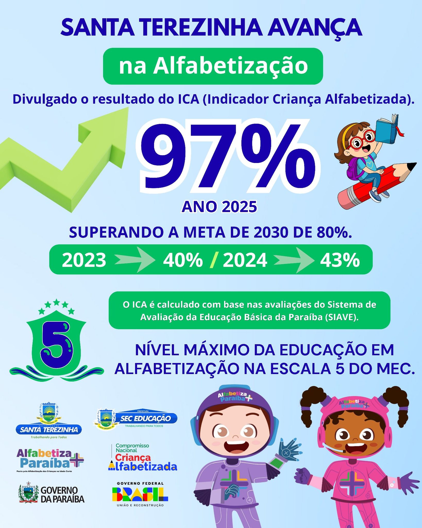 “Com alegria e gratidão, celebramos esse grande resultado do Indicador Criança Alfabetizada ICA de Santa Teresinha. Saímos de 40% em 2023 para 97% das crianças alfabetizadas em 2025, superando a meta estabelecida para nosso município para o ano de 2030! Isso só fortalece nossos esforços e reafirma o compromisso de toda a equipe com a alfabetização de todas as crianças na idade certa. É hora de comemorar, mas também de seguirmos firmes realizando o nosso trabalho com responsabilidade e empenho dobrados para que este resultado siga em ascensão”, enfatizou.