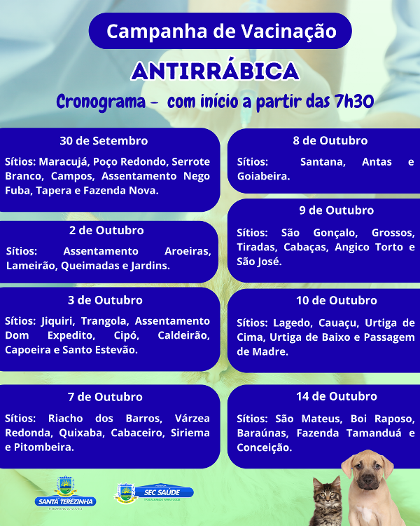 Veja o Cronograma da zona rural da Campanha de Vacinação Antirrábica de Santa Terezinha
