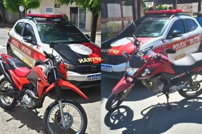Já no início da tarde, durante rondas no bairro São Sebastião, a guarnição identificou uma motocicleta Honda Bros estacionada em uma calçada, ostentando placa do estado do Ceará. A suspeita surgiu após os policiais perceberem inconsistências nos sinais de identificação.