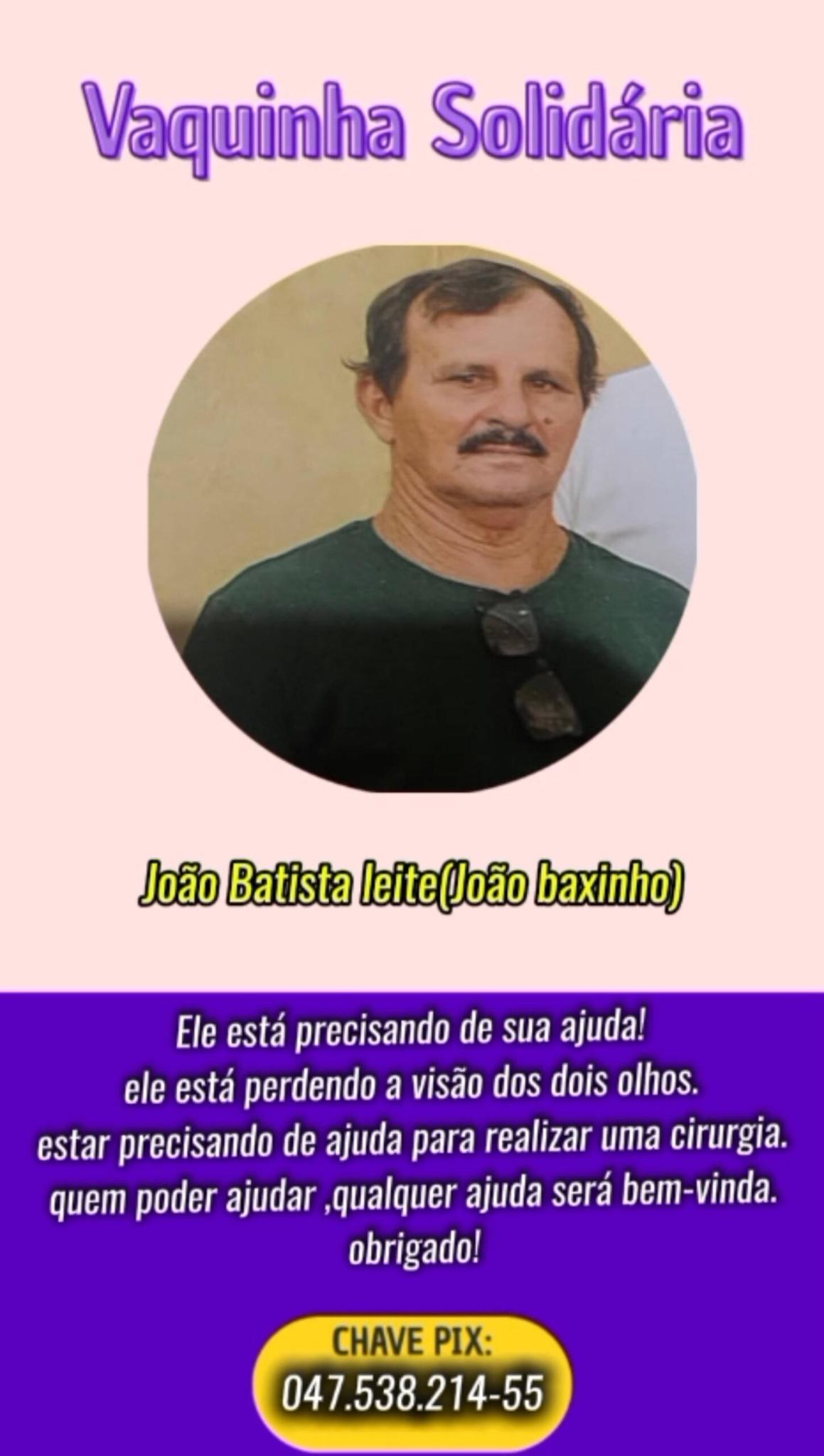 A Família de João Batista Leite (69), conhecido popularmente por João Baixinho, morador do município de Santa Terezinha (PB), criaram uma Vaquinha Solidária para arrecadar recursos financeiros para uma cirurgia nos olhos porque ele está perdendo a visão.