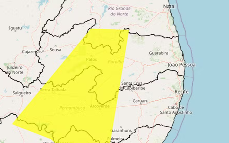 O Instituto Nacional de Meteorologia (Inmet) renovou, nesta sexta-feira (02), o alerta amarelo de perigo potencial de baixa umidade do ar para 79 municípios da Paraíba. O aviso segue válido até às 21h.