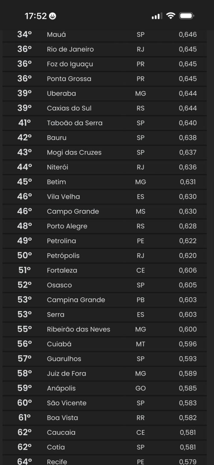 Cabe trazer ainda que os 100 municípios considerados possuem, de acordo com o estudo, 38,6% da população do país (78,3 milhões de habitantes em 2022); 44,2% do PIB com R$ 4,0 trilhões em 2021 (último dado oficial disponível até o momento, os dados de 2022 devem ser divulgados até o final deste ano); PIB per capita cerca de 12,5% maior que a média brasileira (R$ 47,5 mil em 2021); e ainda, concentram 52,3% dos empregos (27,6 milhões de empregos em 2022). Para se ter ideia do alcance da Rainha da Borborema, no Nordeste Campina que alcançou um índice de 0,603 só ficou atrás de Petrolina (PE) na 49ª e Fortaleza (CE) que fica na 51ª e no Brasil a cidade paraibana ficou à frente de cidades como Cuiabá, Guarulhos, Boa Vista, Recife, João Pessoa, São Luiz e etc. Veja o post:
