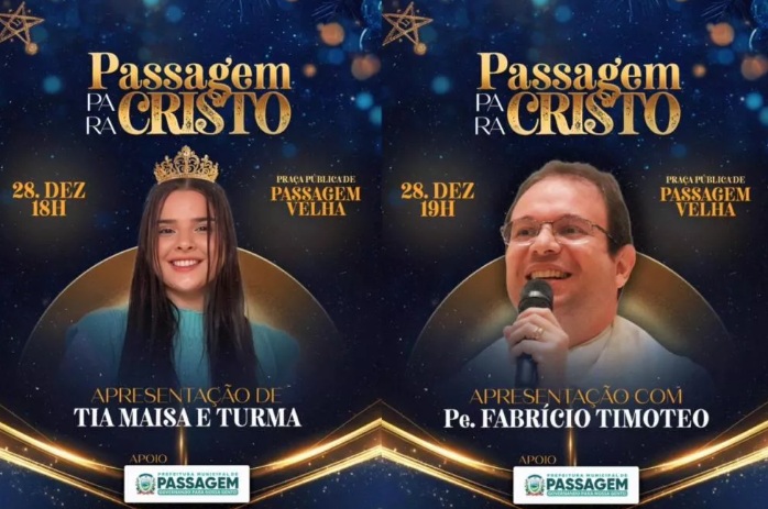 A cidade de Passagem, na Região Metropolitana de Patos, vai sediar uma noite especial de adoração, louvor e entrega a Deus com a realização do evento “Passagem para Cristo”. A programação acontece no próximo domingo, dia 28 de dezembro, a partir das 18h, na Praça Pública de Passagem Velha.