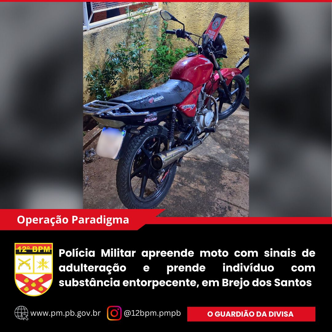 Na noite desta quinta-feira (09) policiais militares do 12º Batalhão apreenderam uma motocicleta Honda Titan vermelha com sinais de adulteração, na cidade de Brejo dos Santos, e com o indivíduo que a pilotava também foram encontradas nove (09) porções de substância análoga a maconha.