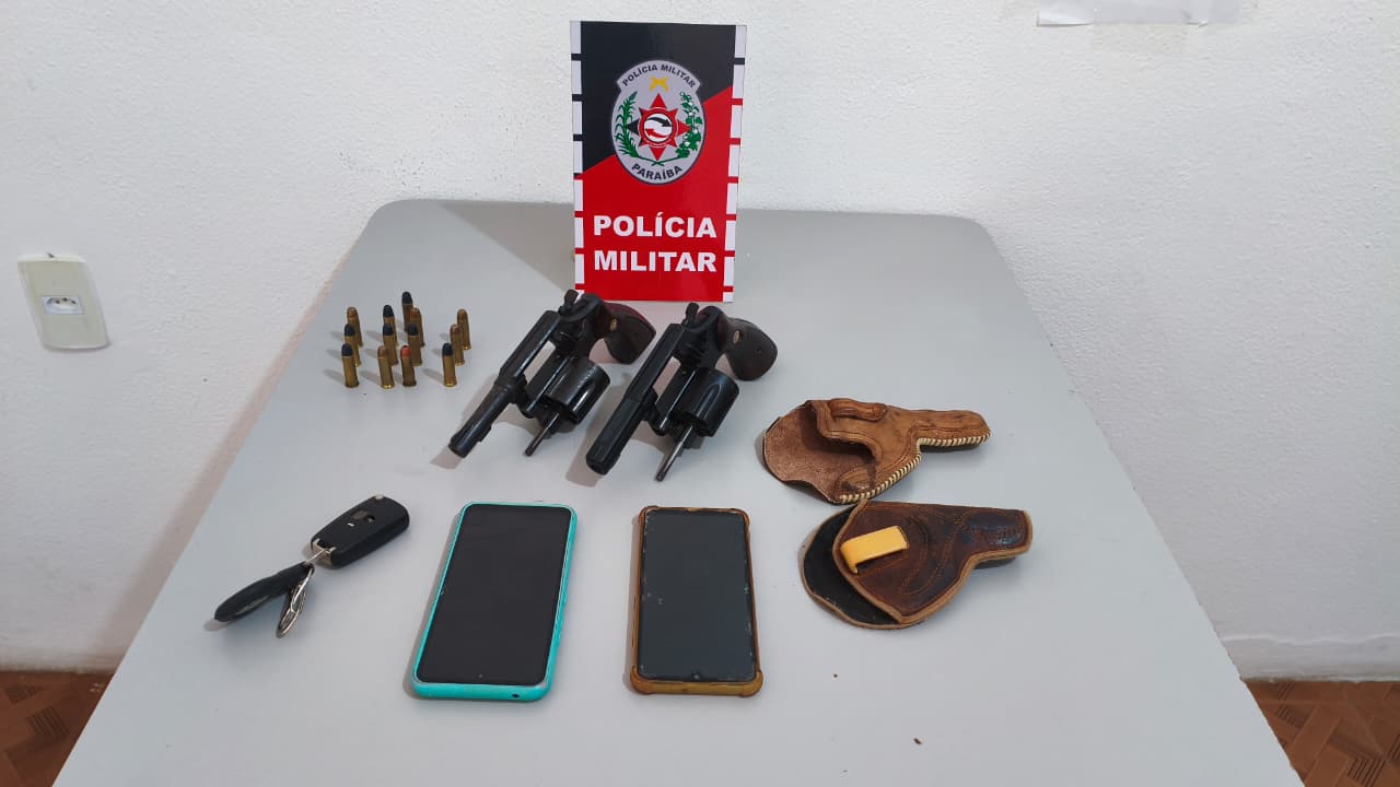 Ao chegarem ao local, os Policiais Militares identificaram o veículo, que tentou evadir-se ao perceber a presença das guarnições. Após acompanhamento e abordagem, foi constatado que os suspeitos portavam duas armas de fogo, sendo dois revólveres calibre .38, além de 13 munições e outros objetos que estavam no interior do automóvel.