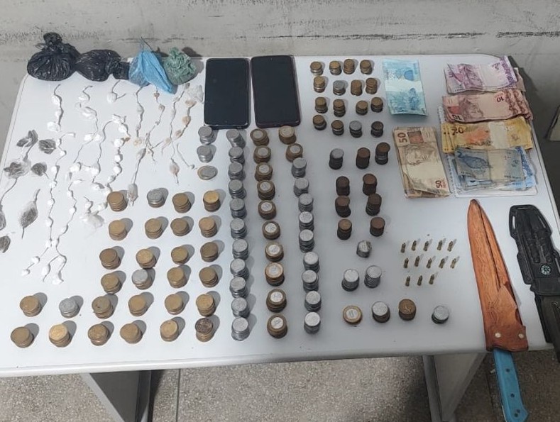 Além dos entorpecentes, os policiais apreenderam 13 munições calibre .22 intactas, um punhal tático, uma faca peixeira de 10 polegadas, dois aparelhos celulares e a quantia de R$ 1.246,45 em cédulas e moedas diversas.