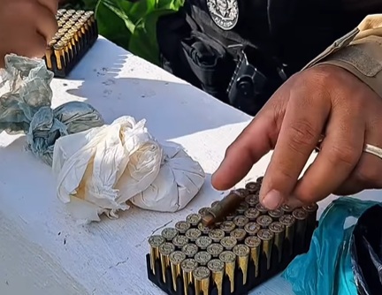 Após denúncias anônimas, a guarnição intensificou as diligências e, na zona rural, no Sítio Bodes, localizou aproximadamente 740g de substância análoga à cocaína, além de 124 munições calibre .40 e 51 munições calibre .38, que estavam escondidas no interior de um reservatório de água, envoltas em sacos plásticos.
