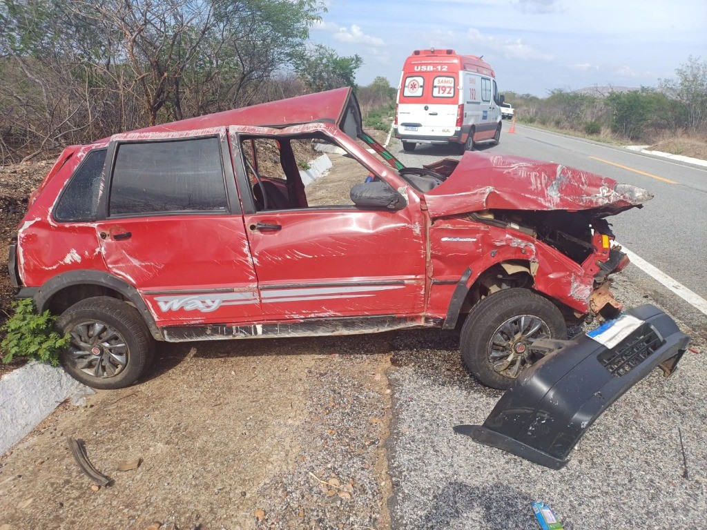 Paulista (PB), 31/01/2026 – No início da tarde deste último sábado (31), por volta das 13h20, um grave sinistro de trânsito foi registrado na BR-427, no Km 14, envolvendo um veículo Fiat/Uno Mille Way, de cor vermelha, ano 2009, com três ocupantes, todos moradores do município de Paulista-PB. Levantamentos realizados pela equipe da PRF que atendeu a ocorrência, apontam que o automóvel seguia no sentido Pombal (PB) a Serra Negra do Norte (RN), saiu da pista próximo à entrada do trevo que dá acesso à cidade de Paulista, seguindo pelo acostamento sem controle, atravessando a via e colidindo contra uma barreira. Com o impacto, o veículo capotou e ficou imobilizado no sentido Pombal-PB.
