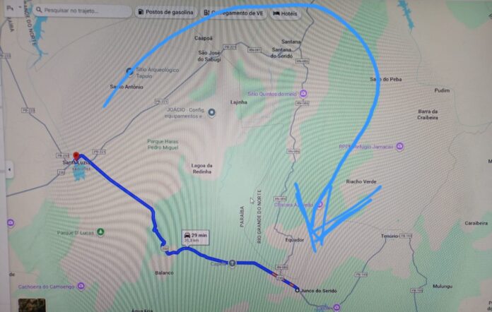 • Para quem segue no sentido contrário (Campina Grande→ Sertão), o trajeto é o inverso: após o Posto Fiscal do Junco, entrar à direita em direção a Equador (RN), depois Santana do Seridó (RN), São José do Sabugi (PB) e retornar a Santa Luzia (PB).