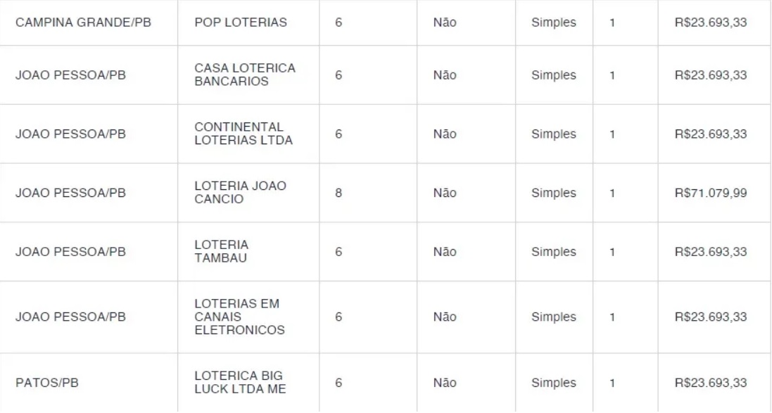 Na Paraíba, uma aposta com oito números faturou, na quina, R$ 71.079,99 (João Pessoa – Lotérica João Câncio). Já outras seis apostas simples com seis números ganharam o prêmio de R$ 23.693,33, cada: